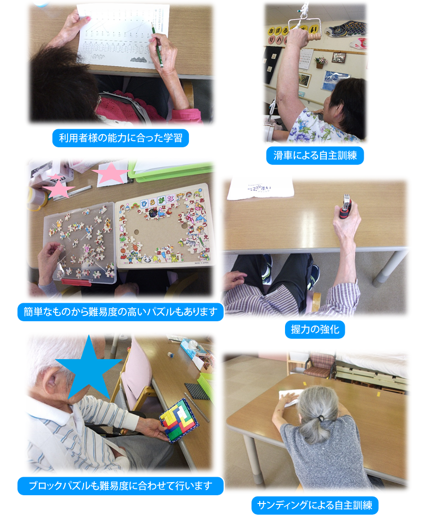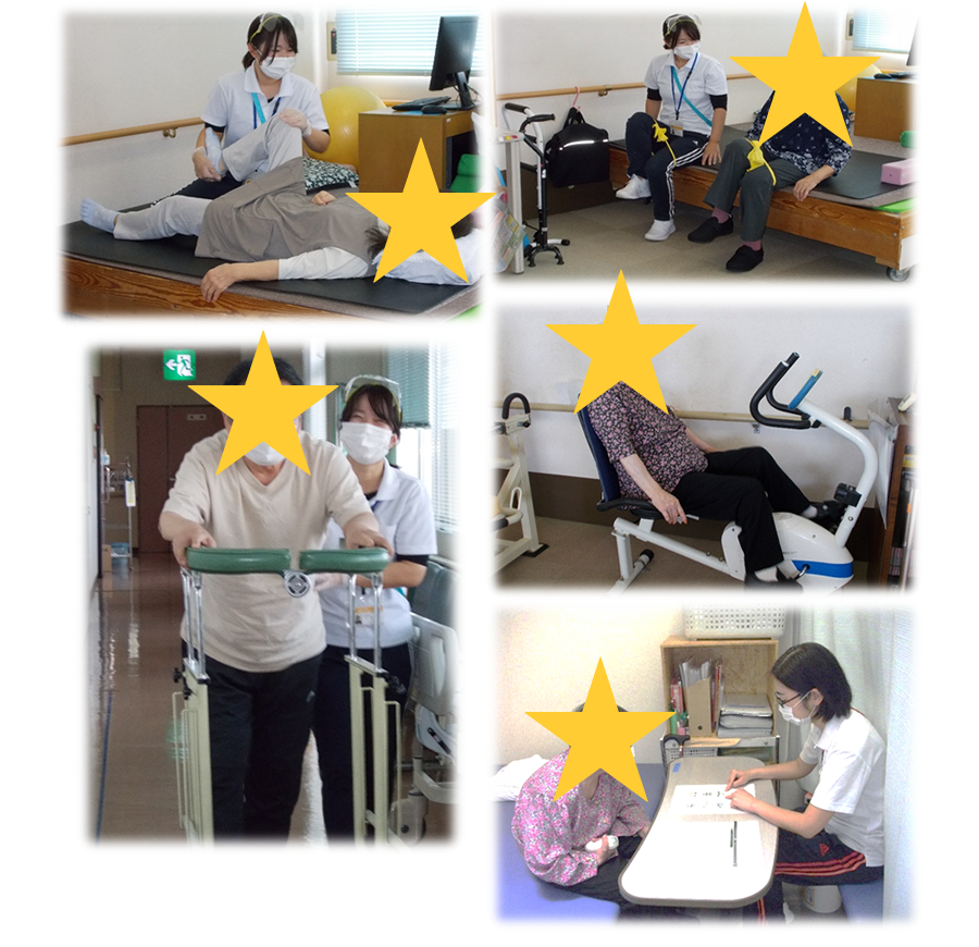 また、療法士の行った評価に基づき、通所リハビリ利用中は、移動・移乗・トイレ動作など、利用者様ご自身の残存機能を生かした介助を行い、安全かつ心身機能の維持・向上を図れるようにお手伝いいたします。