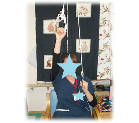 大胸筋・小胸筋・上腕二頭筋・上腕三頭筋の筋力増強運動を行い上肢の粗大筋力や巧緻性を向上し起居動作の安定や食事動作や書字動作の改善が図られます。 |